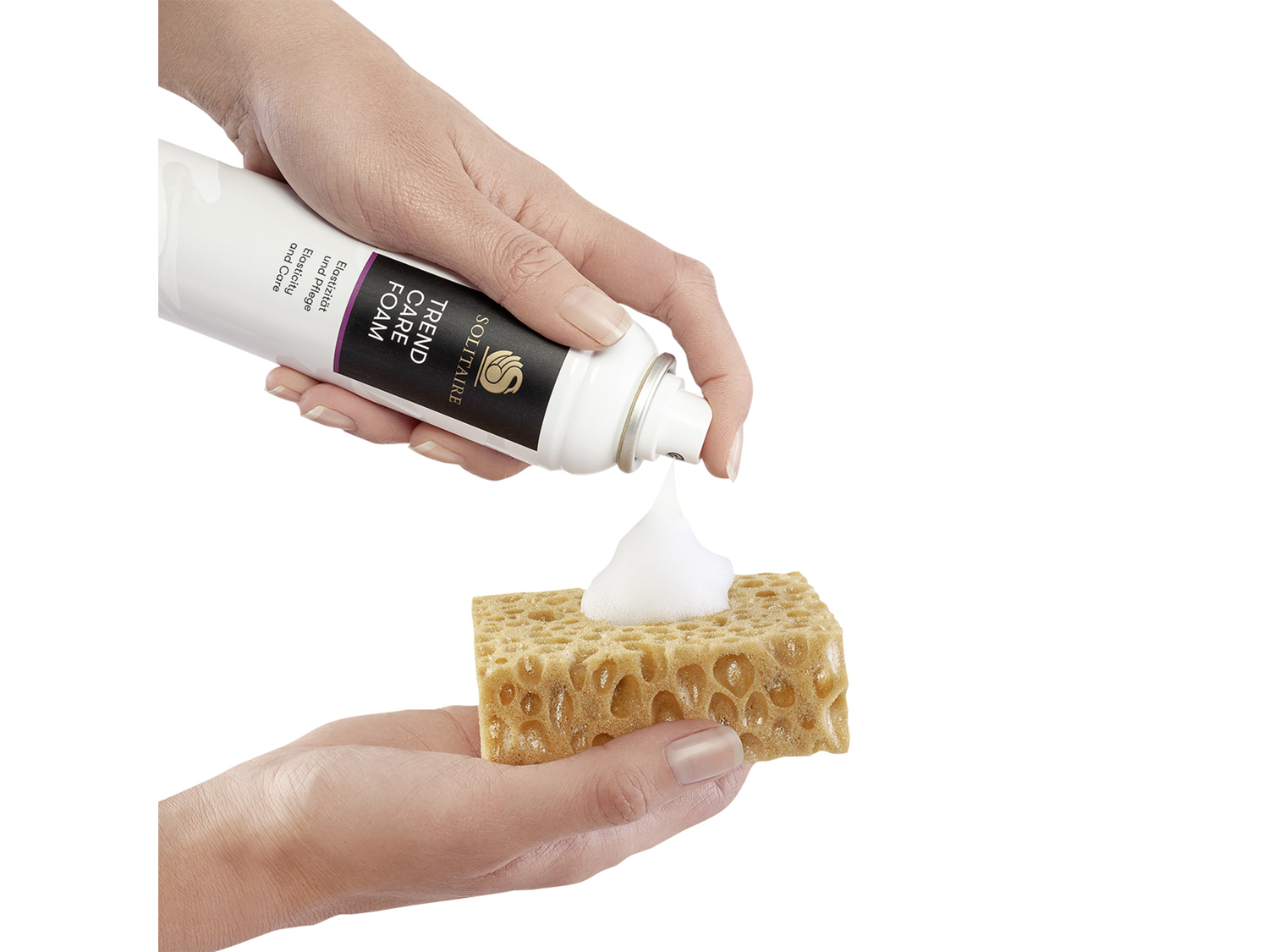 Eine etwa walnussgroße Menge Trend Care Sprühschaum auf ein weiches Tuch oder einen Schwamm sprühen und mit sanftem Druck auf dem Material verteilen.