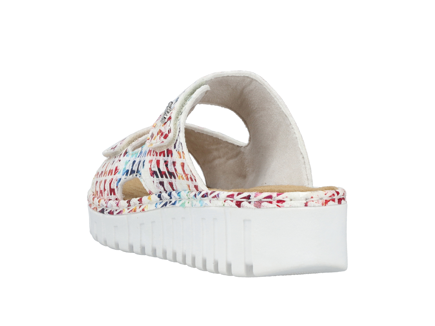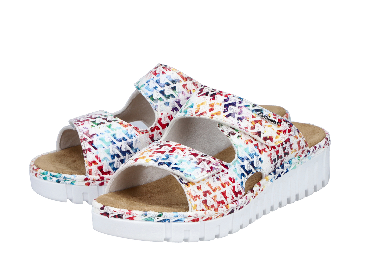 Sommer-Feeling für deine Füße! Diese mehrfarbigen Rieker Pantoletten für Damen sind perfekt geeignet für jeden Tag. Die traditionelle Anflechter-Machart macht den Schuh besonders flexibel, robust und sorgt für eine tolle Passform. Die Pantoletten sind dank einem zweifachen Klettverschluss in Nullkommanichts angezogen. Mit der schockabsorbierenden und leichten Sohle mit Keilabsatz ist ein gedämpftes Laufgefühl Programm. Darüber hinaus ist die Decksohle extra weich. Die schmale Passform E 1/2 bietet dem Fuß zusätzlichen Halt im Schuh. Modisches Wellness-Feeling im Stil von Rieker!