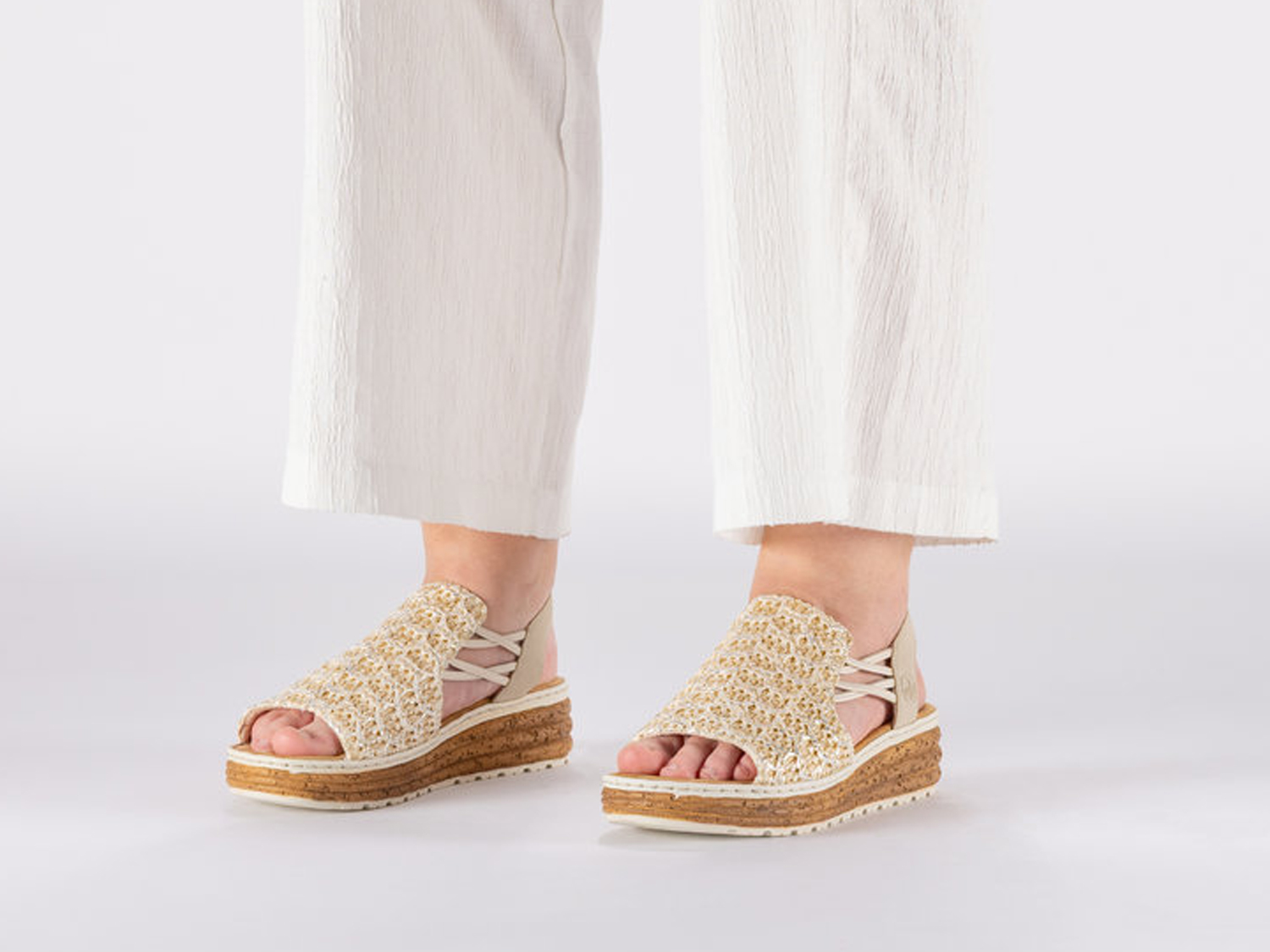 Sandalen-Liebe: Mal schlicht, mal bunt und auffällig. Diese beigen Rieker Keilsandaletten überzeugen mit echtem Komfort für die Füße. Die traditionelle Anflechter-Machart macht den Schuh besonders flexibel, robust und sorgt für eine tolle Passform. Der Gummizug macht das An- und Ausziehen einfach und bequem. Die Sohle mit Keilabsatz ist sowohl leicht als auch schockabsorbierend und bietet damit ein doppeltes Wohlgefühl bei jedem Schritt. Darüber hinaus ist die Decksohle extra weich. Dank der Extraweite H ist genügend Platz im Vorfußbereich geboten. Trageluxus pur!