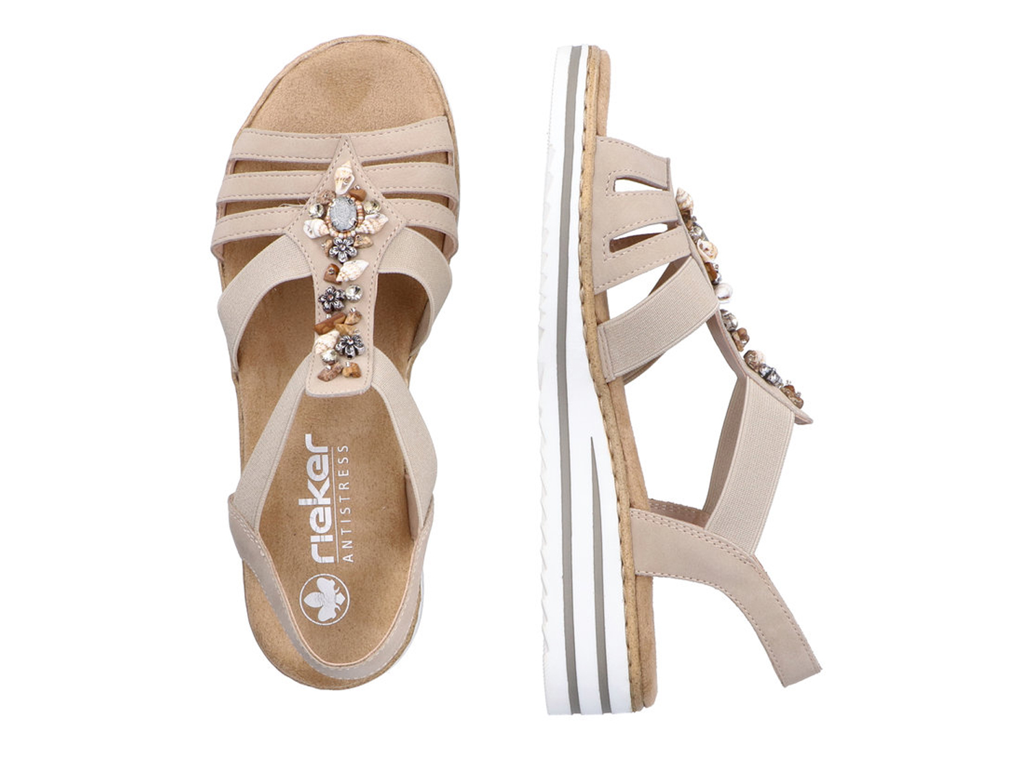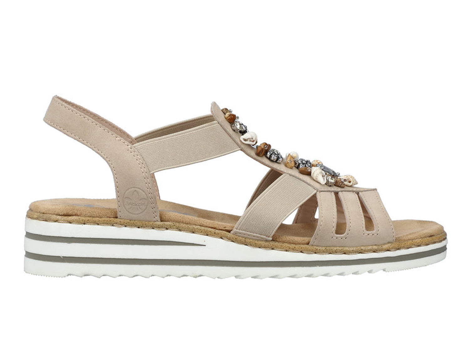 Style UND Komfort - hier gibt es kein oder! Mit diesen beigen Rieker Keilsandaletten bist du cool und lässig auf Achse. Die traditionelle Anflechter-Machart macht den Schuh besonders flexibel, robust und sorgt für eine tolle Passform. Der Gummizug erleichtert das An- und Ausziehen besonders. Die schockabsorbierende und leichte Sohle mit Keilabsatz bietet anhaltendes Wohlgefühl auch an langen Tagen. Obendrein sorgt die extra weiche Decksohle für eine Extraportion Tragekomfort. Durch die schmale Passform E 1/2 sitzt der Schuh wie angegossen. 100% Lieblingsschuh-Potential!