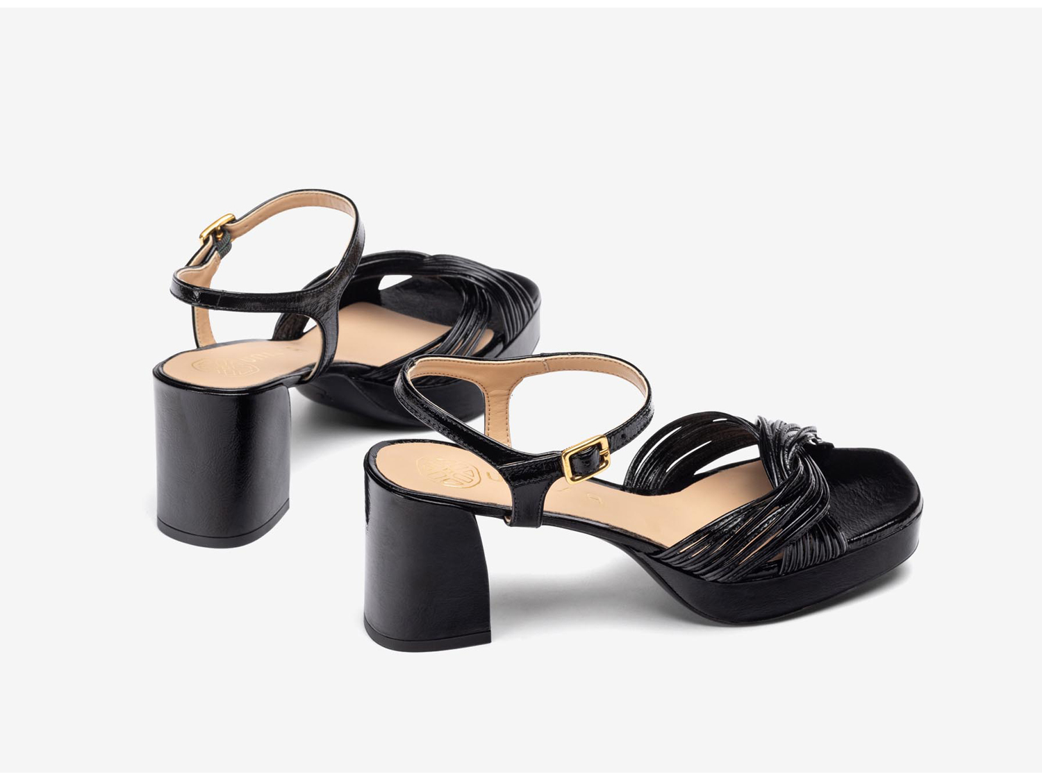 Sandalen aus Knautschlackleder mit eckiger Zehenpartie. Feine Lacklederriemchen im vorderen Bereich. 2,5 cm hohes Plateau und 7 cm Absatz, farblich passend bezogen. Am Knöchel mit einer Metallschnalle zu verstellen. Rutschfeste Gummisohle. Die perfekten Sandalen, um jedem Look das gewisse Etwas zu verleihen.