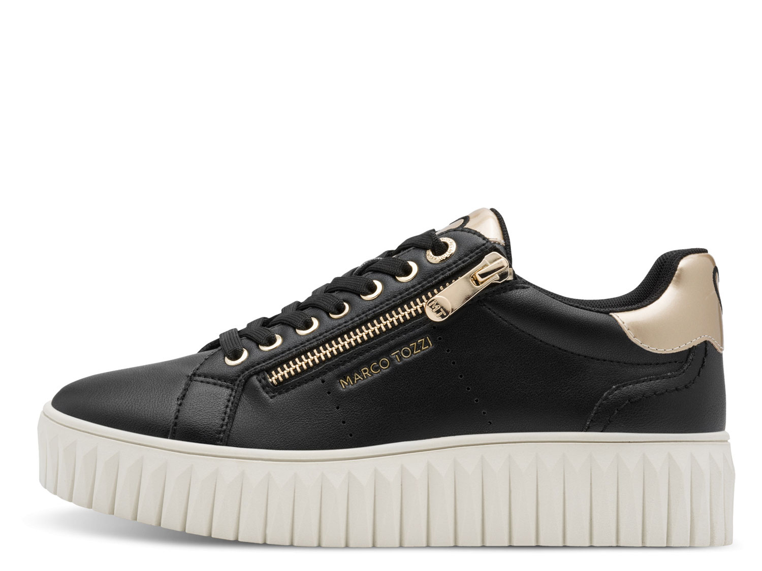 Mit diesem Sneaker von MARCO TOZZI genießt du stylisches Design und durchdachten Komfort in einem modernen Look. Das hochwertige Synthetik-Obermaterial sorgt für eine edle Ausstrahlung, während die F-Weite dir eine angenehme Passform bietet - ideal für entspanntes Tragen im Alltag. Die 15 mm hohe Plateausohle verleiht dem Schuh eine zeitgemäße Silhouette und sorgt für ein dezentes Plus an Höhe, perfekt kombiniert mit der sportiven, runden Schuhspitze, die dem Gesamtdesign einen lässigen Akzent gibt. Besonders praktisch sind der Reißverschluss und die Schnürung, die für einfaches Hineinschlüpfen und eine individuelle Anpassung sorgen. Im Inneren sorgen zwei innovative Features für maximalen Komfort: das herausnehmbare Fußbett (%u201ERemovable Footbed%u201C) ermöglicht den Einsatz eigener Einlagen, während das softe FEEL ME Fußbett sich deinem Fuß optimal anpasst und so ein wunderbar softes Laufgefühl bietet - auch an langen Tagen. Mit einer Schafthöhe von 6,5 cm ist dieser Sneaker die perfekte Wahl für die Übergangszeit, sei es im Frühling oder Herbst, und lässt sich vielseitig zu lässigen Jeans oder femininen Kleidern stylen. So setzt du ein modisches Statement und genießt gleichzeitig höchsten Tragekomfort - jeden Tag aufs Neue.