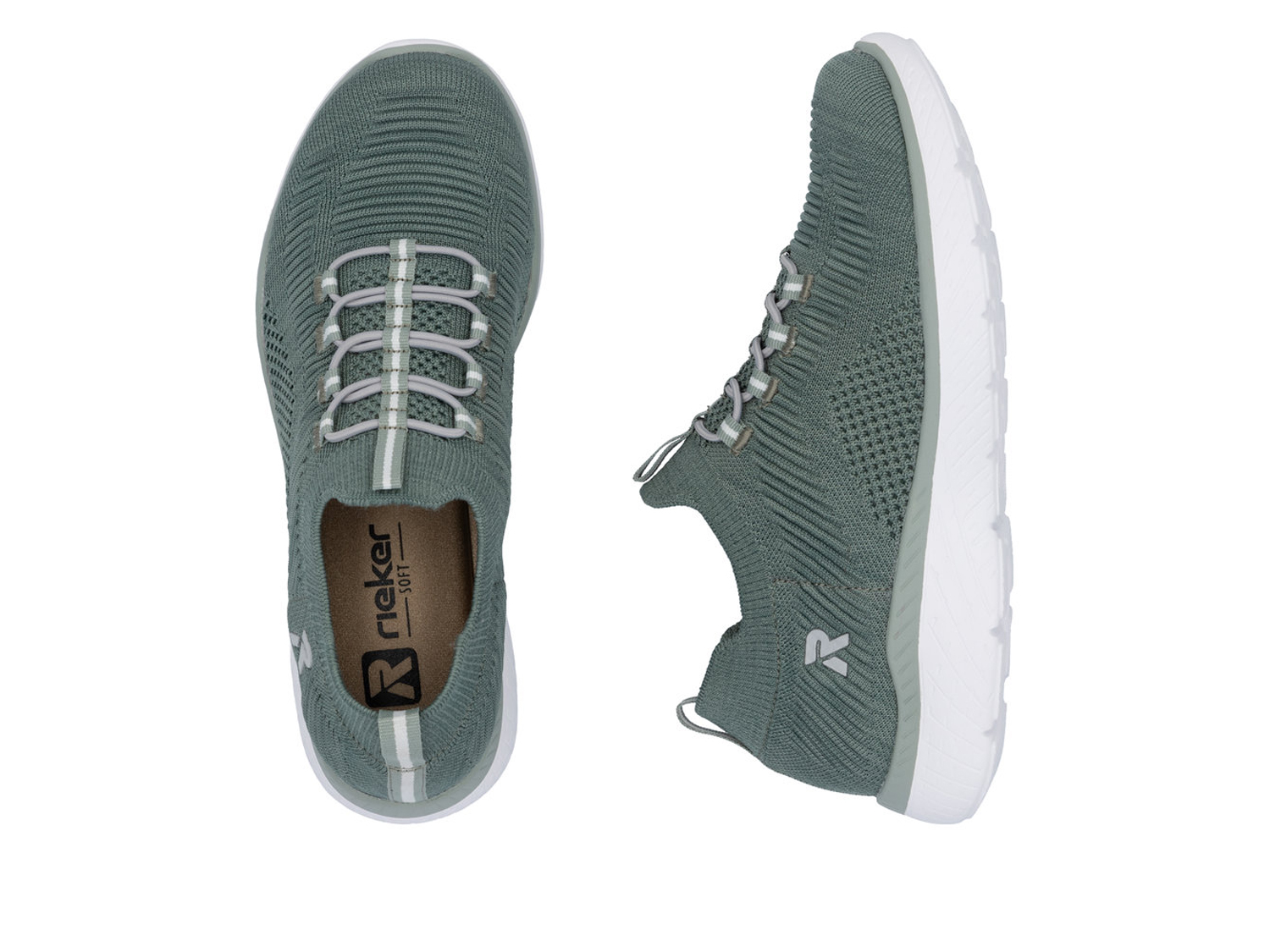 Mintfarbene Rieker Slipper für Damen aus wertigem Textil. Gummizug plus elastischer Schaftrand - ermöglicht einfaches An- und Ausziehen. Die ultraleichte, flexible EVA-Sohle erlaubt maximale Schnelligkeit und Agilität. Die MemoSoft-Decksohle bildet den Fuß im weichen Schaum ab und passt sich so individuell an. On top garantiert die Komfortweite eine perfekte Passform.