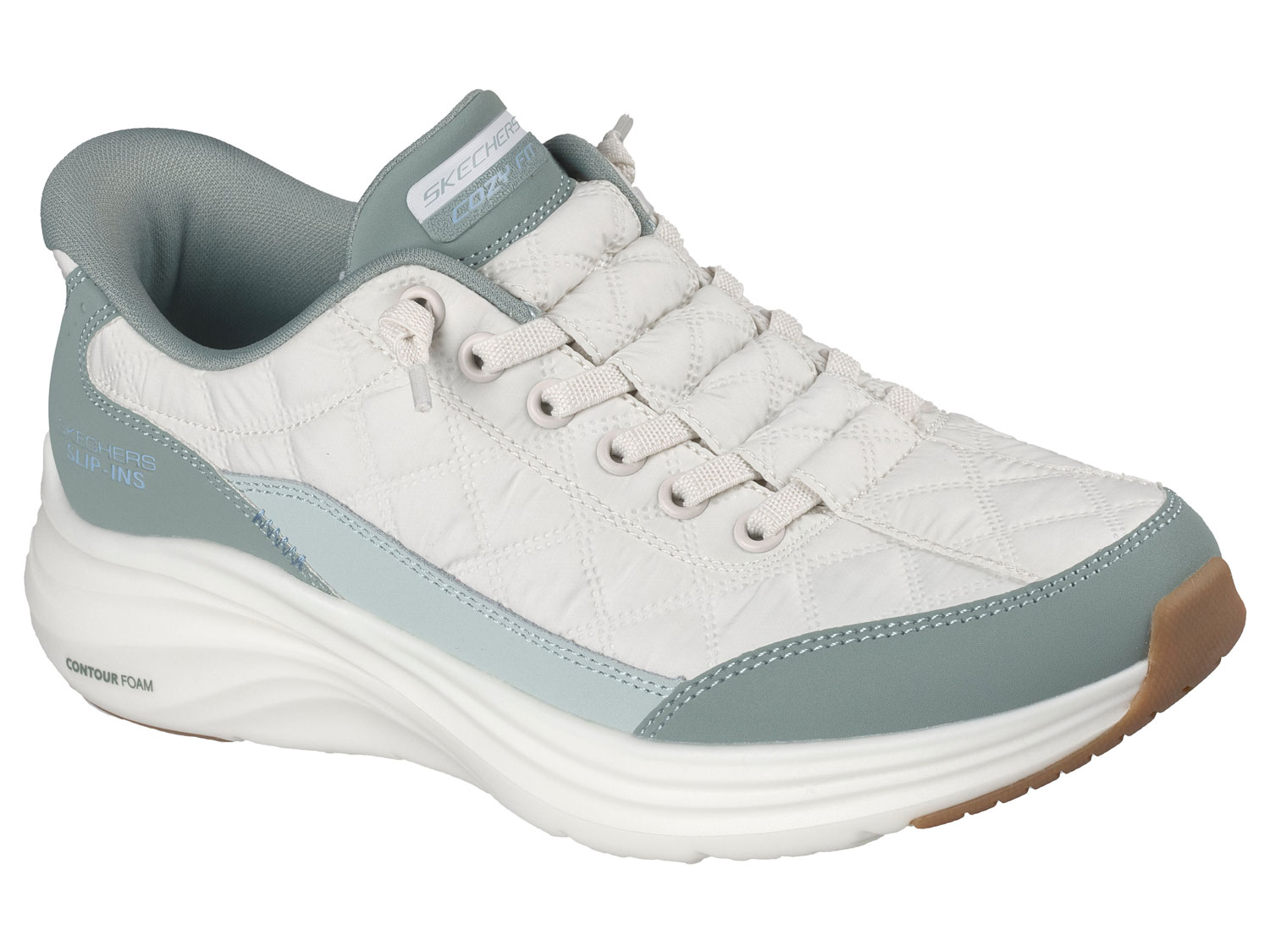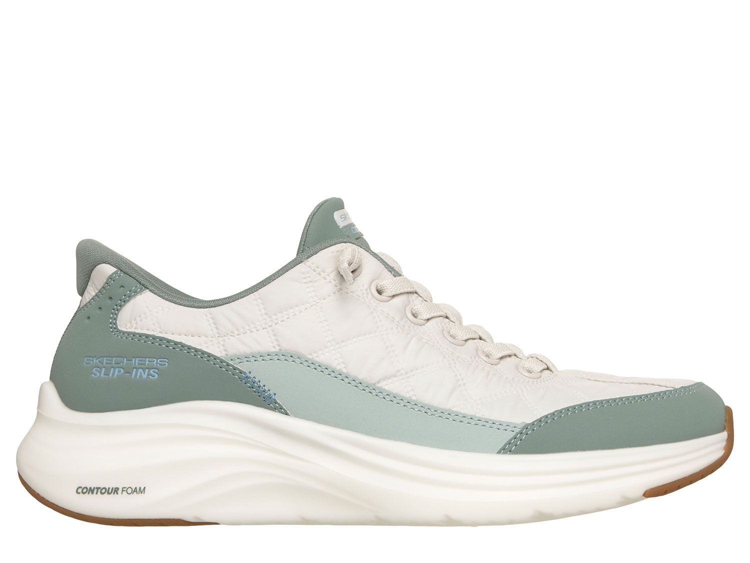 Verwöhne deine Füße mit einem lässigen und bequemen Look mit dem Skechers Hands Free Slip-Ins®: Contour Foam%u2122 - Cozy Fit%u2122. Dieser Slip-On ist mit dem exklusiven Skechers Fersenkissen (Heel Pillow%u2122)%u2122 ausgestattet und verfügt über ein Obermaterial aus gestepptem Cozy Fit%u2122-Mesh mit Metallic-Duraleder, eine lose Stretch-Schnürung, eine Zwischensohle mit Contour Foam%u2122 Dämpfung und eine gepolsterte Skechers Air-Cooled Memory Foam%u2122-Einlegesohle.