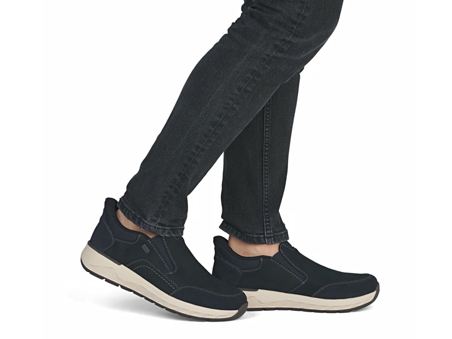 Style UND Komfort - hier gibt es kein oder! Diese blauen Rieker Slipper für Herren aus Rauleder sind perfekt geeignet für jeden Tag. Der Gummizug macht das An- und Ausziehen einfach und bequem. Die flexible und sehr leichte Sohle sorgt für ein angenehmes Tragegefühl. Dank der gepolsterten und herausnehmbaren Einlegesohle ist bester Komfort gegeben. Der Schuh ist in Extraweite geschnitten. Die RiekerTEX-Technologie hält die Füße bei jedem Wetter trocken. Hineinschlüpfen und wohlfühlen!