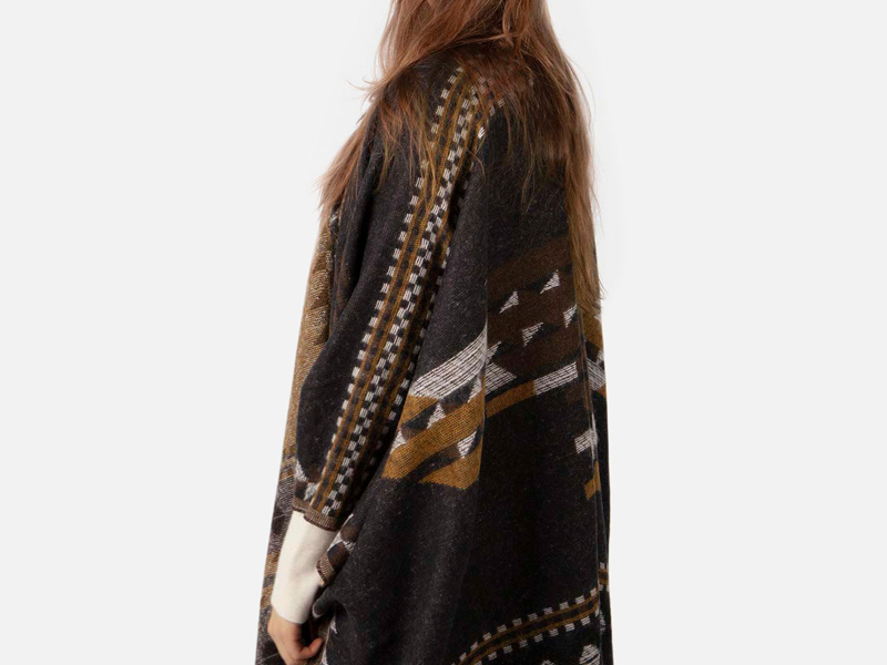 Der Layula Poncho ist ein großer gewebter Poncho mit aztekischem Muster. Der Poncho hat Armlöcher und ist mit Fransen versehen.